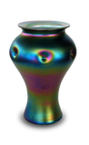 Series of four vases in iridised black inspired by art nouveau models. Version 1, curvy vase with dimples around the top. The iridescent black coloring resembles crude oil. Color: black with white interior. Technique: blown handmade glass.